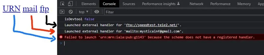 On running above html code, the browser console displaying URN as Failed to launch 'urn:mrn:iala:pub:g1143' because the scheme does not have a registered handle,for mail and ftp, it displays Launched external handler In the above example, mailto: is one of the URI Scheme in which “mailto” will be scheme name and email id is the scheme path.